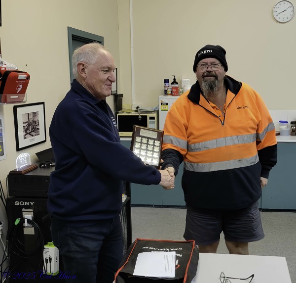 Peter VK5BE presents the Roy Goodwin award to John VK5JOB for his great work in coordinating the catering at the 2025 Convention