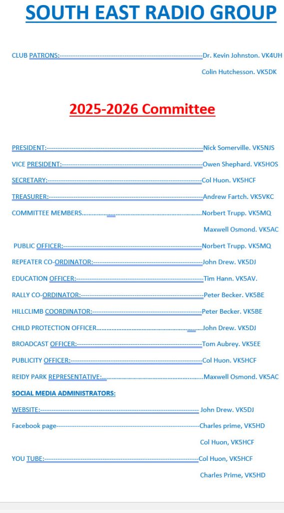 The budget was approved with the addition of an amount of $8000 for possible work at VK5RBT Willalooka, a possible move for VK5RKN at Mt Benson to a site 2km south and a possible new site north of Kingston (near Taratap) to improve coverage along the Coorong.
