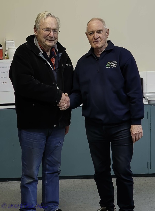 Peter Becker (outgoing President on right) is awarded life membership by SERG. John VK5DJ (acting chairperson on left) had the honour of congratulating Peter for his outstanding contribution of 8 years as President and strong leadership and support for working bees and projects.