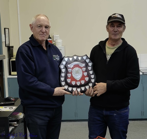 Peter VK5BE presents the President’s Appreciation Award to Nick VK5NJS for his enthusiastic support for many, many club projects.